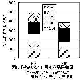 無電照条件下での4月までの商品果収量は、10a当たり約4〜5t程度で、商品果率が高い(図1、表3)。