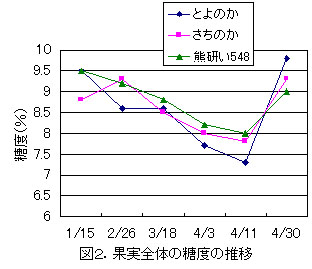 糖度は安定して高く、収穫期間を通じて香りが良く、食味は優れる(図2)。