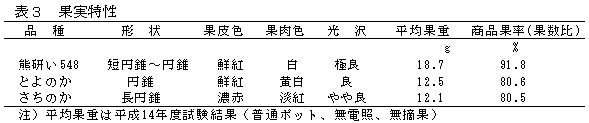 果実は「とよのか」より大きく、果形は短円錐〜円錐形で、果皮は鮮紅色で光沢が良い(表3)。