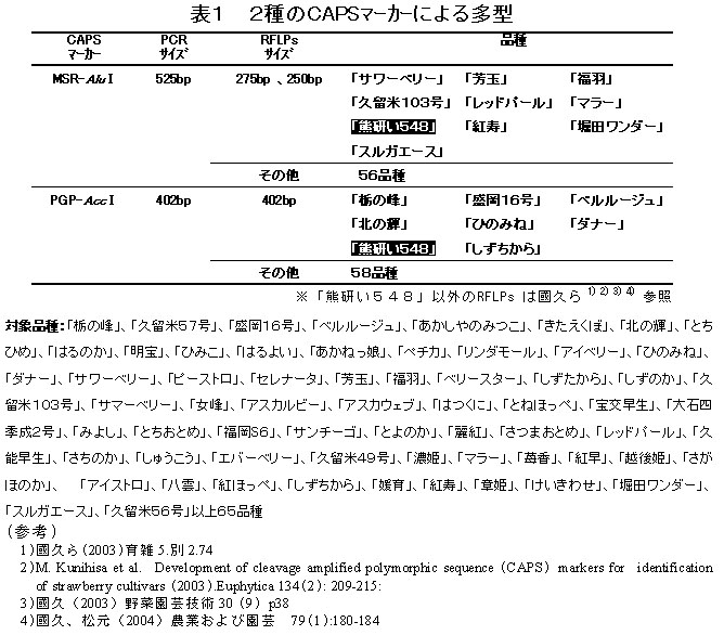 - 野菜茶業研究所で開発されたイチゴの品種間に多型を示すCAPSマーカーのうち、MSR-Alu Iで275bpと250bpのRFLPsが得られ、かつPGP-AccTで402bpのRFLPが得られるのは66品種中「熊研い548」のみである。このためMSR-Alu TとPGP-Acc Tの2種のCAPSマーカーで「熊研い548」と主要65品種との識別が可能である(表1)。