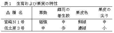 - 「宮崎N1号」は、強勢で果色の優れる紡錘形果実品種である。普通栽培と半促成栽培に適する。