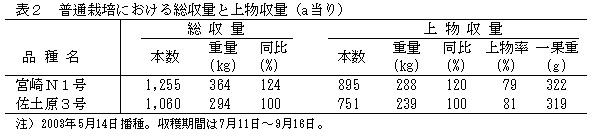 収量は極めて多く、普通栽培と半促成栽培のいずれにおいても「佐土原3号」に比べて総収量、上物収量ともに20%程度増収する(表2、表3)。