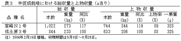 表3 半促成栽培のおける総収量と上物収量(a当り)