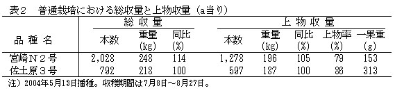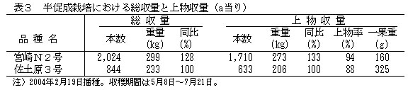 収量は極めて多く、普通栽培と半促成栽培のいずれにおいても、「佐土原3号」に比べて総収量、上物収量ともに増収する(表2、表3)。