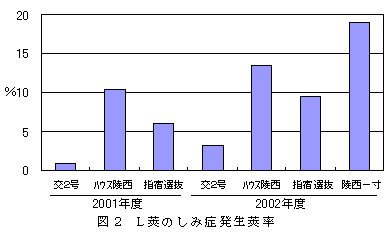 しみ症の発生はL莢での発生莢率が3%以下であり、「ハウス陵西」、「指宿選抜」、「陵西一寸」に比べて極めて少ない(図2)。