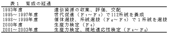 1993年度に「陵西一寸」を母に、「坊津選抜系統」を父として交配し、世代促進を繰り返して、1998〜1999年度に選抜・固定した系統である(表1、図1)。