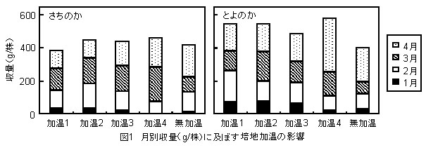 「とよのか」では1〜2月の初期収量は培地温度の高い方が多くなるが、「さちのか」では最高培地温が摂氏25度前後となるような培地加温(加温1)を行うと、摂氏20度前後の培地加温(加温2)に比較して、初期収量は低下する(図1)。