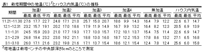 ポリプロピレン製の栽培槽のイチゴ高設ベンチでは、培地加温を行わないと培地の最低温度はハウス内気温近くまで低下する(表1)。