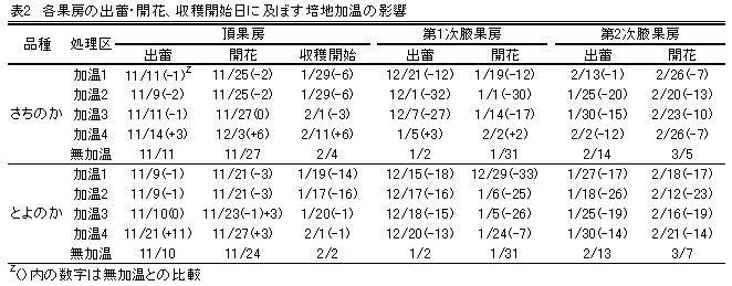 「さちのか」、「とよのか」で栽培期間中の最低培地温が摂氏12度以上になるように培地加温(加温1〜3)を行うと、頂果房の収穫開始ならびに第1および2次腋果房の出蕾・開花は早まる。しかし、「さちのか」の最高培地温が摂氏25度前後となるような培地加温(加温1)では、摂氏20度前後の培地加温(加温2)に比較して、第1および2次腋果房の出蕾・開花が遅れる。最低培地温が摂氏10度(平均培地温摂氏13〜14度)になるように加温(加温4)しても、「さちのか」では頂果房と第1次腋果房の、「とよのか」では頂果房の出蕾・開花の促進効果は見られない(表2)。