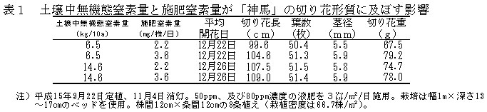 表1 土壌中無機態窒素量と施肥窒素量が「神馬」の切り花形質に及ぼす影響
