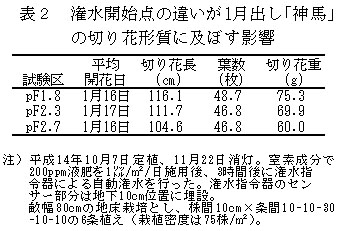 潅水同時施肥における潅水開始点をpF1.8〜2.3とすると品質の優れた切り花を得られる(表2)。