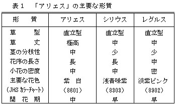 - 花色が紫白色覆輪で開花揃い優れるデルフィニウムF1品種「アリエス」を育成した。