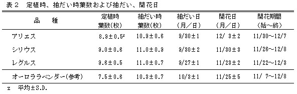 表2 定植時、抽だい時葉数および抽だい、開花日