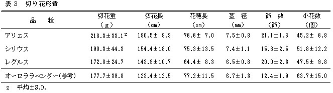 花序の長さは長で小花の密度は中である。八重咲きで花冠は大である.がく片数は13枚と多く、全形は楕円形である(表1)。また、切り花長をはじめとする形質もよく揃う(表3)。