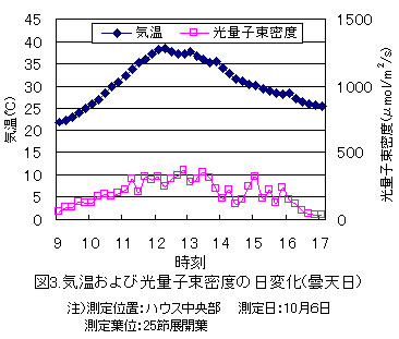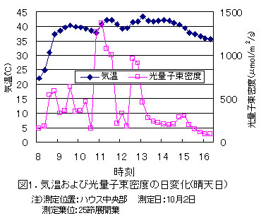- ビニールハウス栽培下におけるパプリカ群落内の個葉の光合成速度の日変化は晴天日では比較的高い値で推移するが、その変動幅は大きい。一方、曇天日でも増減するが、その日中の変動幅は小さい。