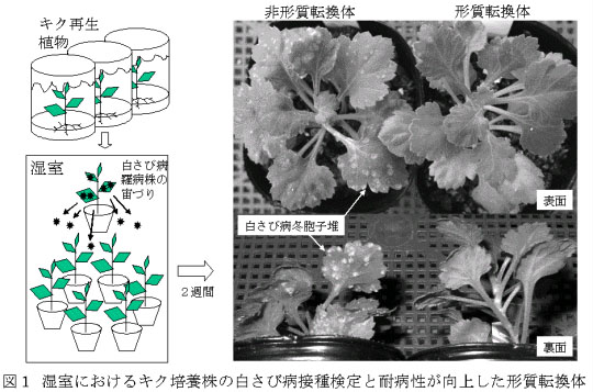 図1 湿室におけるキク培養株の白さび病接種検定と耐病性が向上した形質転換体