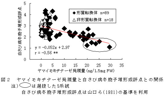 図2 ヤマイモキチナーゼ発現量と白さび病冬胞子堆形成評点との関係