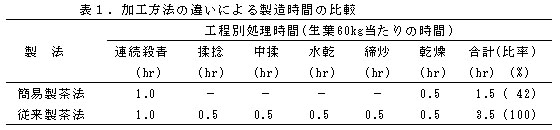 釜炒りによる連続殺青工程と連続通風乾燥工程の組み合わせにより、従来の釜炒り製玉緑茶製造6工程の内、4工程を省くことが可能で、製造時間を従来比約40%に短縮できる(図1、表1)。