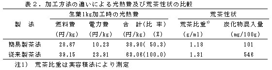 表2 加工方法の違いによる光熱費及び荒茶性状の比較