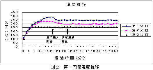 温度自動制御システムで加圧型重油バーナーの燃焼を制御すると、第一円筒の温度推移は点火後16分で設定温度に達し、生葉投入開始10分後に炒り葉時の温度に設定した後は、設定温度から設定温度の摂氏-10度までの範囲内でほぼ安定する(表1、図2)。