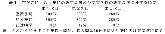 空焚き時の第一火口及び第二火口の温度設定は生葉投入時の温度低下を考慮して、炒り葉時設定温度より第一火口で摂氏40度、第二火口で摂氏30度程度高く設定し、生葉投入開始から10分後に炒り葉時設定温度に設定変更する(表1)。