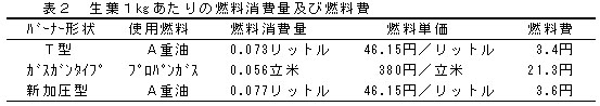 生葉1kgあたりの燃料消費量は0.077リットル、燃料費は3.6円となりT型重油バーナーと同程度である(表2)。