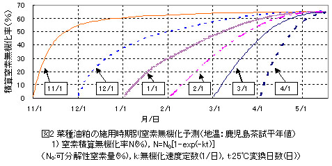 図2 菜種油粕の施用時期別窒素無機化予測(地温:鹿児島茶試平年値)