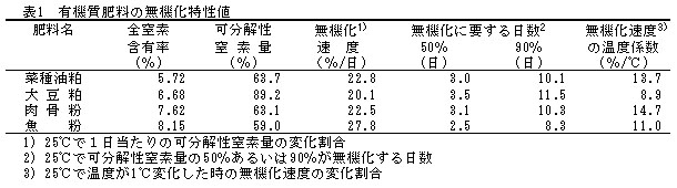 2)各温度の無機化量を単純型モデルN=No[1-exp(-kt)](N:窒素無機化率(%)、No:可分解性窒素量(%)、k:無機化速度定数(1/日)、t:摂氏25度変換日数(日))にあてはめ、無機化特性値を求めた。