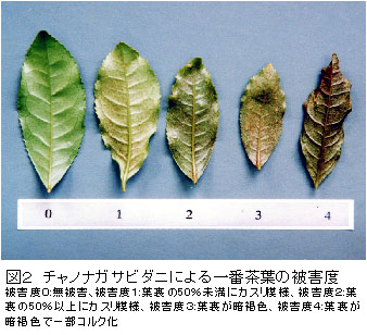 チャノナガサビダニに加害された茶葉は、軽微な加害では葉裏が淡褐色でカスリ模様の症状を呈し(被害度1)、加害が激しくなるにつれて褐色部分が葉裏全体に広がり葉縁が波打つ(被害度2)。さらに被害が進むと、葉裏全体が暗褐色となり(被害度3)、葉裏の一部がコルク化し(被害度4)、落葉する(図2)。