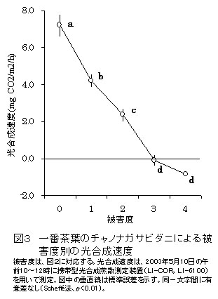 チャノナガサビダニに加害された一番茶葉のみかけの光合成速度は、被害度が大きくなるにしたがって低下し、被害度1では健全葉の58%に、被害度2では33%に、被害度3以上では光合成速度が呼吸量を下回りマイナスの値になる(図3)。
