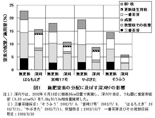 二番茶後の深刈り更新時に施用した窒素が新芽、成葉、枝、幹等のチャ地上部へ分配される量は、品種、系統に関わらず無更新時よりも少なくなる(図1)。