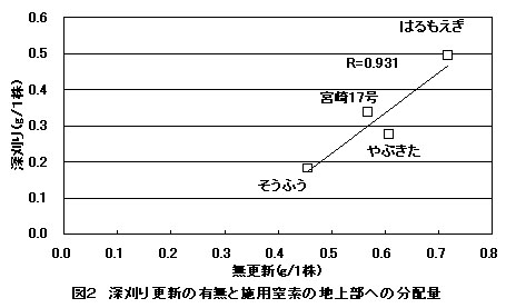 図2 深刈り更新の有無と施用窒素の地上部への分配量