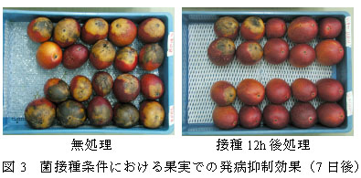 接種12h後、24h後処理ともに果実での発病抑制効果が認められ、特に接種12h後処理で84.3の高い防除価が認められた(表1、図3)。