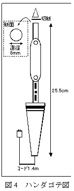 市販ハンダゴテの先端部を平らに切断し、マンゴー果実の果梗部に約5秒間押し当て熱処理する(図1)。先端部の直径は8mm、処理時の温度は摂氏300度に達する(図4)。