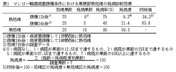 表1 マンゴー軸腐病接種条件における果梗部熱処理の発病抑制効果