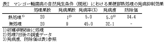表2 マンゴー軸腐病の自然発生条件(現地)における果梗部熱処理の発病抑制効果