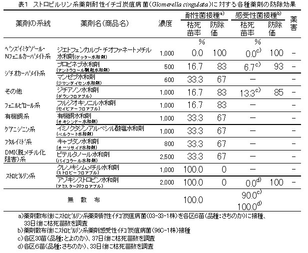 表1 ストロビルリン系薬剤耐性イチゴ炭疽病菌(Glomerella cingulata)に対する各種薬剤の防除効果