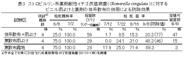 表3 ストロビルリン系薬剤耐性イチゴ炭疽病菌(Glomerella cingulata)に対するビニル雨よけと薬剤の体系散布の併用による防除効果