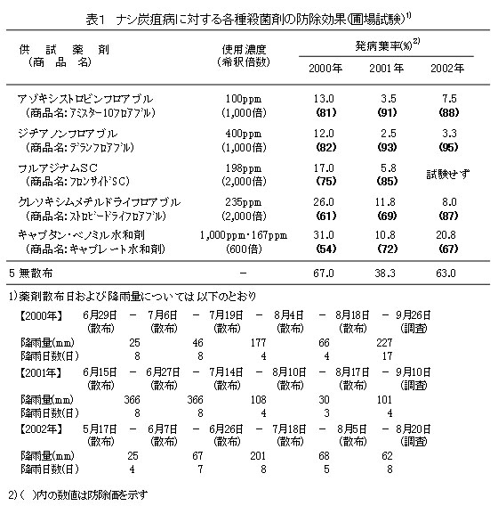 表1 ナシ炭疽病に対する各種殺菌剤の防除効果(圃場試験)1)