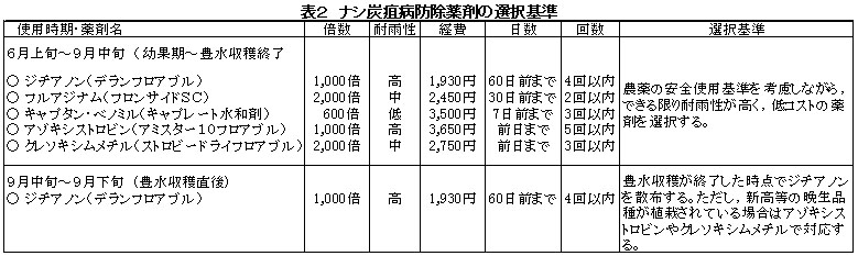 表2 ナシ炭疽病防除薬剤の選択基準