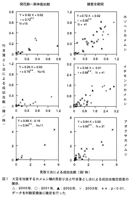 - 叩き落とし法と見取り法による大豆上のカメムシ類の推定密度は,正の相関関係にある。