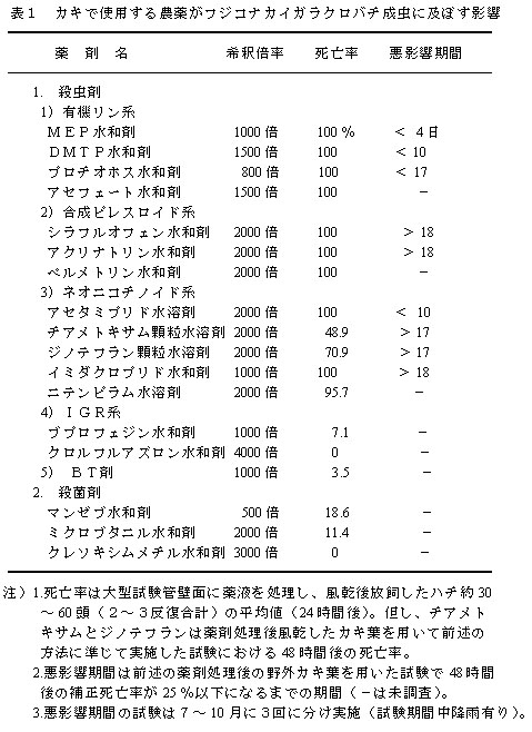 表1 カキで使用する農薬がフジコナカイガラクロバチ成虫に及ぼす影響
