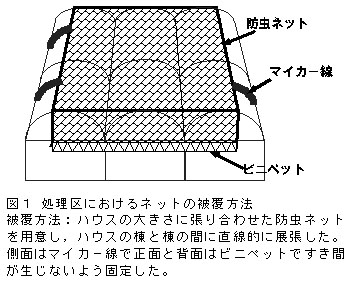 - ハウス開口部に目合い4mmの防虫ネットを被覆することで、ハウス内へのワタヘリクロノメイガおよびオオタバコガの侵入を防止できる。防虫ネットを被覆したハウス内の晴天日の最高気温は、被覆しないハウスに比べて摂氏1.5〜2.0度上昇するが、日平均温度および日最低湿度の差は小さい。