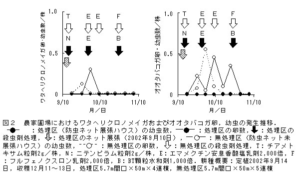 図2 農家圃場におけるワタヘリクロノメイガおよびオオタバコガ卵、幼虫の発生推移