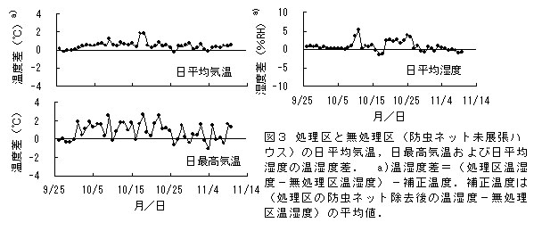 図3 処理区と無処理区(防虫ネット未展張ハウス)の日平均気温、日最高気温および日平均湿度の温湿度差