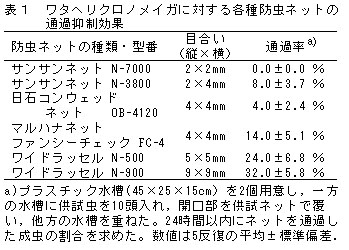 ワタヘリクロノメイガのネット通過を完全に防止するためには目合い2mmが必要であるが、目合い4mmの防虫ネットでも80%以上の個体の通過を妨げることができる(表1)。
