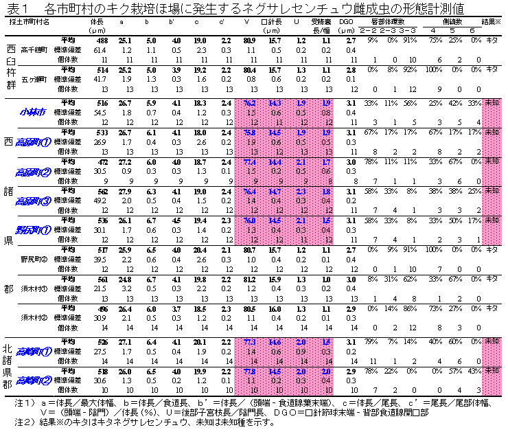 表1 各市町村のキク栽培ほ場に発生するネグサレセンチュウ雌成虫の形態計測値