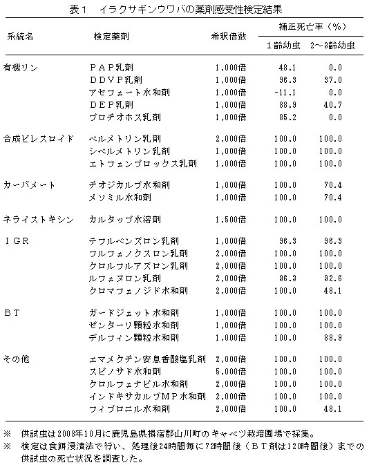 有機リン系以外では、クロマフェノジド水和剤およびフィプロニル水和剤に対して2〜3齢幼虫の感受性が低いが、合成ピレスロイド系殺虫剤、BT剤、エマメクチン安息香酸塩乳剤、スピノサド水和剤、クロルフェナピル水和剤、インドキサカルブMP水和剤に対する感受性は高い(表1)。