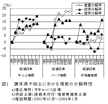 冬キャベツ生育期間中の堆肥の分解特性(埋設法)から、牛ふん堆肥は炭素及び窒素の分解が順調に行われ、施用後速やかな無機態窒素の放出が期待できるが、バーク堆肥及び好塩菌堆肥は窒素分解率が低く、分解に時間を要する(図1)。