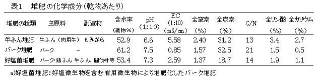 供試した堆肥の全窒素含量は牛ふん堆肥、バーク堆肥、好塩菌堆肥の順に高く、C/N比はバーク堆肥が21と最も高い。また全リン酸及び全カリウム含量は牛ふん堆肥、好塩菌堆肥、バーク堆肥の順に高い(表1)。